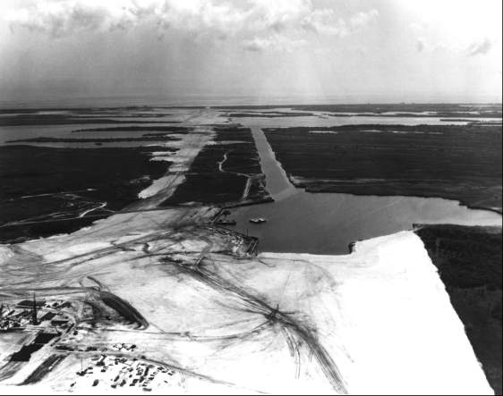 The barge canal and turning basin, with assembly building site in lower left, August 1963.