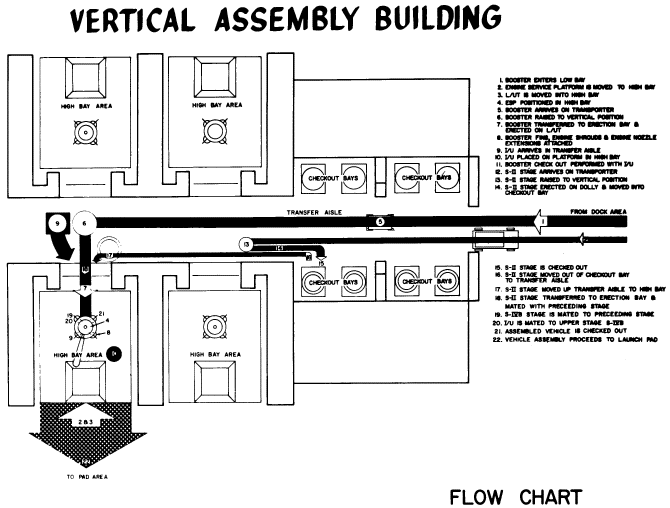 Stacking the space vehicle. The piece by piece buildup of the space vehicle in the assembly building. (1) The S-II is placed on top of the S-IC.
