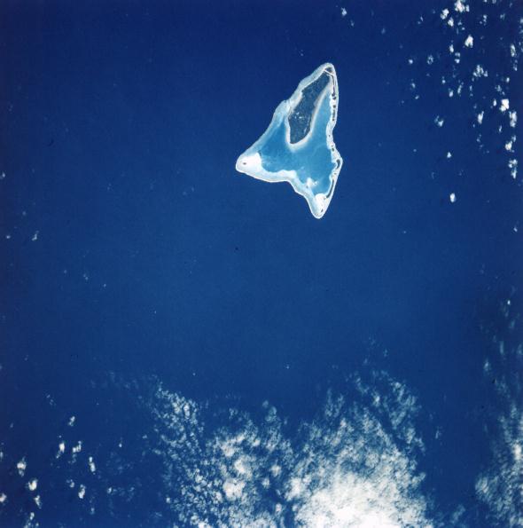 Aitutaki Atoll in the Cook Islands clearly shows the contrast between the deep Pacific Ocean, the barrier reef, the lagoon, and the tree- covered main island. Aitutaki is about 1,300 kilometers south-east of Samoa 16 July 1975. (AST-1-39) |