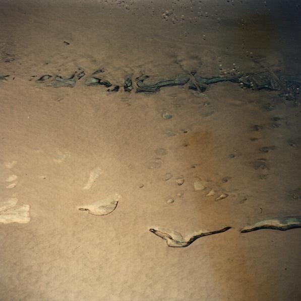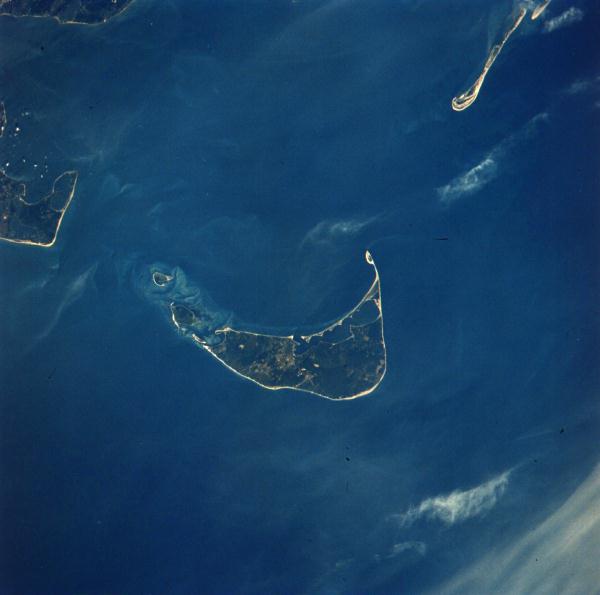 Nantucket Island, Massachusetts, is at the center of the photograph. At the upper right, a long sandy point, Monomoy, extends southward from Cape Cod. At the left center is Chappaquiddick Island and part of Martha's Vineyard. These islands represent the remnants of the terminal moraine of the great continental glaciers of the past. 23 July 1975. (AST-1-63) |