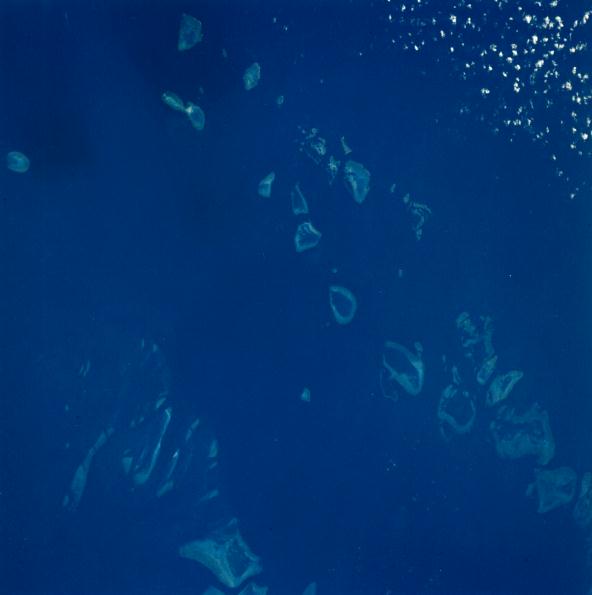 East of Queensland, Australia, the Great Barrier Reef extends for over 2,000 kilometers. The bottom detail and reefs in the area known as the Cumberland Islands are clearly seen. 20 July 1975. (AST-2-104) |