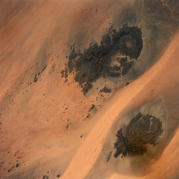 The area shown is where Libya, Egypt, and Sudan join in the east central Sahara. The circular dark basaltic intrusions are Jebel Uweinat (upper r{jebel Arkenu (lower right). The harsh Sahara winds move sand along paths that resemble rivers. 20 July 1975. (AST-2-130) |
