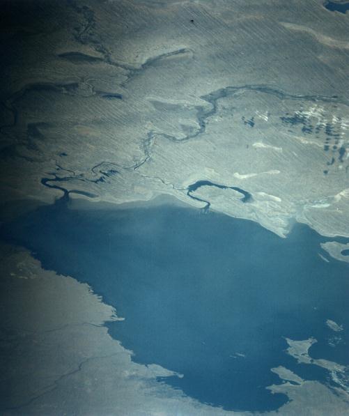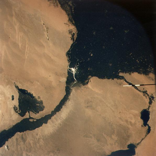 Sun glitter highlights the division of the Nile into the western Rashud (Rosetta) and eastern Dumyat (Damietta) branches, which formed the great triangular delta fanning out to the Mediterranean Sea. In the lower left the valley of the Nile is quite narrow (10 to 20 kilometers) and entirely under cultivation. At lower left center the blue-green El Faiyum Depression is similarly cultivated. The lake is about 40 meters below sea level. In the lower right the Suez Canal can be seen from Suez northward past the Bitter Lakes to Ismailiya. 19 July 1975. (AST-9-556) |