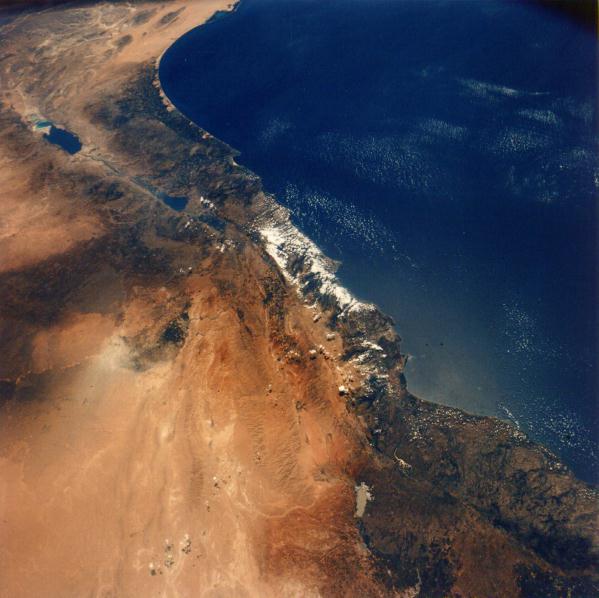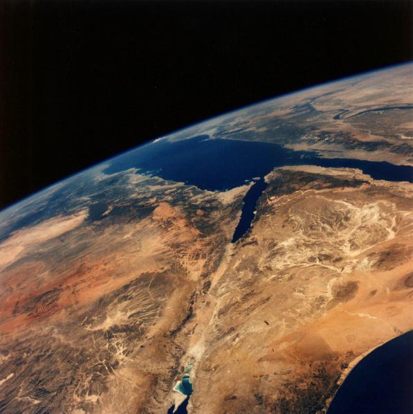 A unique view looking south at portions of Israel (lower center), Saudi Arabia (upper left), Egypt (upper right), and Jordan (lower left) clearly shows the great rifts that have developed into the Red Sea, Gulf of Suez, Gulf of Aqaba, and Dead Sea (lower center). The fertile Nile Valley is clearly traced in the upper right, Sinai is at the lower right, and the harsh deserts of the Al Hijaz are to the left. One can trace a portion of the ancient pilgrim route of the followers of Muhammad to Al Madinah and Mecca from the Levant. 19 July 1975. (AST-9-560) |