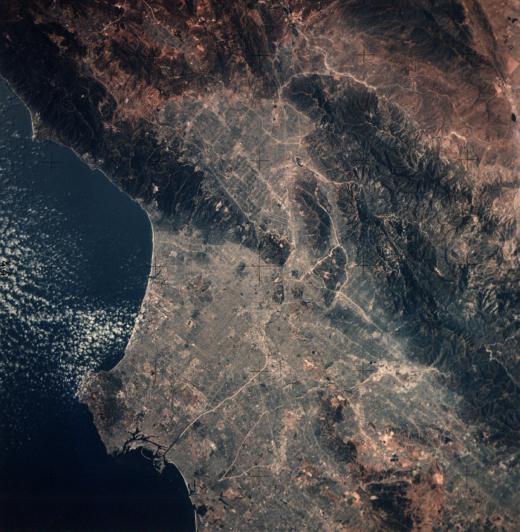 A large portion of the Los Angeles Basin is clearly seen in the lower portion of the photograph. The San Fernando Valley is at the upper center. The San Gabriel Mountains cross from upper center to lower right. The light lines that crisscross the photograph are in some cases freeways and in others paved rivers. The Pacific Coast is seen from Point Dume southward to Seal Beach. 16 July 1975. (AST-14-881) |