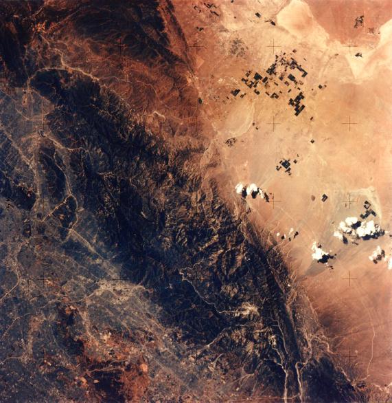 A portion of the Los Angeles urban complex is seen in the left and lower portion of the photograph. The San Gabriel Mountains cross from the upper left corner to the lower right. The very active San Andreas Fault can be clearly traced as a straight line from the upper center edge to the lower right edge. The high San Gabriel Mountains block moisture reaching the Mojave Desert (right side), where irrigated fields clearly stand out. The dark fan at the right center is the result of a massive mud slide that originated near Wrightwood. 16 July 1975. (AST-14-882) |