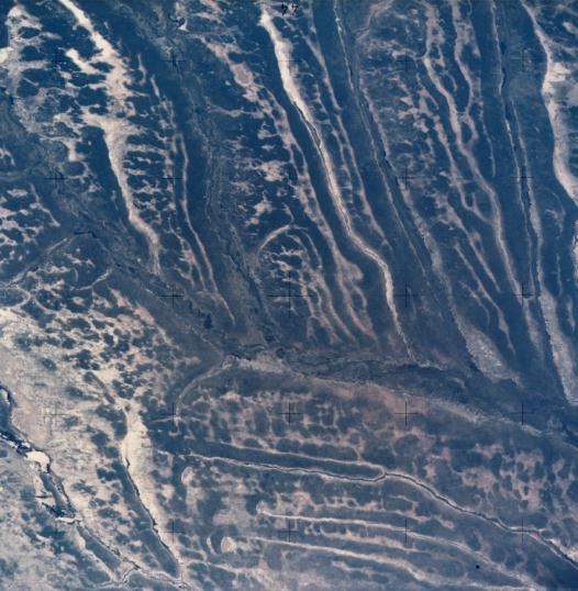 A most unique land form and drainage pattern is seen in the area of Angola known as Moxico and Cuando Cubango. The Cuando River crosses the photograph from upper left to lower right. The rivers flow southeast in straight parallel valleys 10 to 30 kilometers apart. South of the Cuando River, they flow parallel and straight east but 5 to 10 kilometers apart. In the lower left part the Cuito River system is seen. 18 July 1975. (AST14-890) |