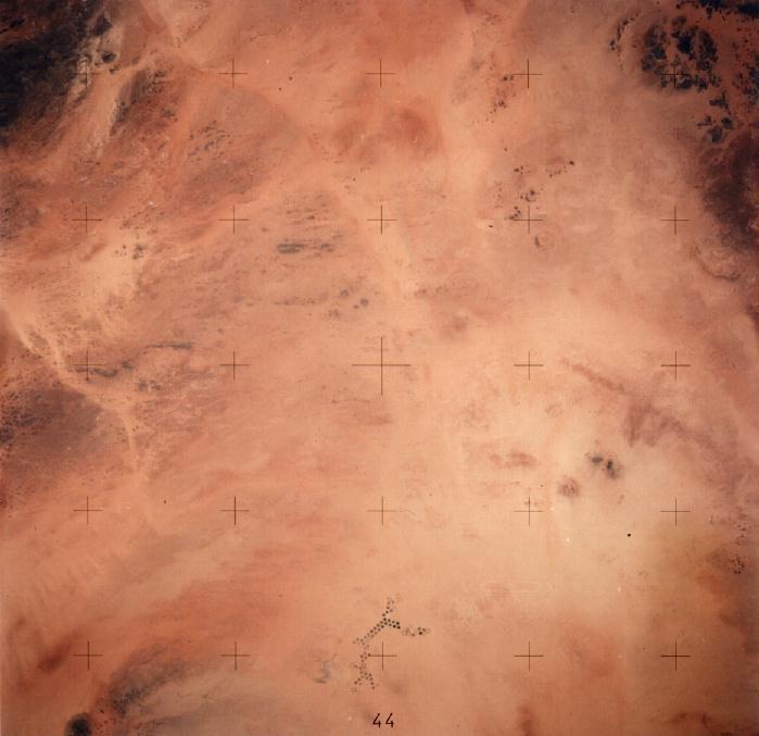 The giant swing-arm irrigation systems common to the American desert invade the Sahara at Libya's Al Kufra Oasis (lower center). It is said that the water removed here fell to the earth in this massive basin many thousands of years ago. 20 July 1975. (AST-16-1244) |