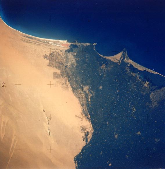 Egypt's second city Alexandria is located in the upper center coast to the left of the curved bay, which was the site of the Battle of the Nile. The Rosetta Nile can be traced from the lower center to its mouth. The buff-color Western Desert shows areas of reclamation under development. The thin dark area in the lower center left is Wadi el Natrun, a series of ten salt lakes below sea level. 20 July 1975. (AST-16-1257) |