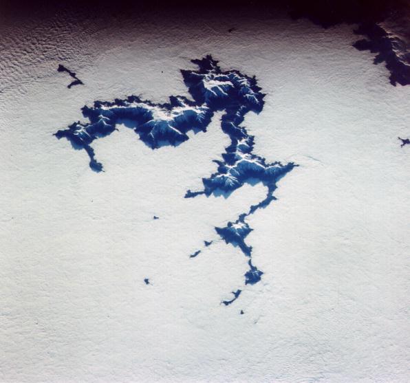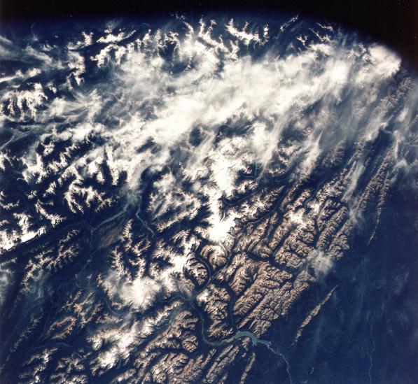 The Canadian Rockies of British Columbia and Alberta show extensive snow fields and glaciers in the area of Banff, Jasper, and Glacier (Canada) National Parks. The North Saskatchewan River is in the lower center. The Columbia River is to the left. Mount Columbia - Alberta's highest - the Athabasca Glacier, and the Clemenceau Icefield are clearly seen near the center. 23 July 1975. (AST-19-1570) |
