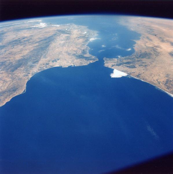 The astronaut's view of the approach to Gibraltar is well demonstrated in this photograph. Spain and Portugal are to the left. Morocco and Algeria are to the right. The Mediterranean Sea is in the background. 20 July 1975. (AST- 27-2363) |