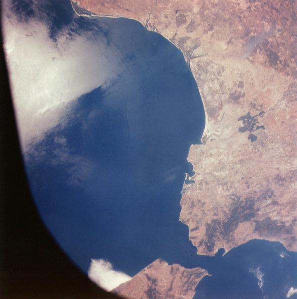 An excellent vertical view of the Strait of Gibraltar was made about 1 minute after AST-27-2363. Morocco and Tangier are at the lower center. Spain and Cadiz are to the right. The Huelva-Palos area, Columbus' point of departure for the new world, is at the upper center. A small portion of Portugal is along the upper edge. Cape Trafalgar, the location of the great sea battle, guards the Atlantic side of the important strait. 20 July 1975. (AST-27-2366) |