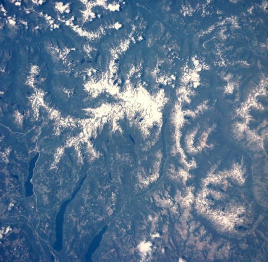Washington's Cascade Mountains are still snow covered in late July. In the lower left, Interstate 90 passes Cle Elum, Kachess, and Keechelus Lakes and loops over Snoqualmie Pass. The Stevens Pass Highway and Cascade Tunnel are in the upper right. Areas of controversial timber "clear cutting" are easily delineated. 20 July 1975. (AST-30-2601) |