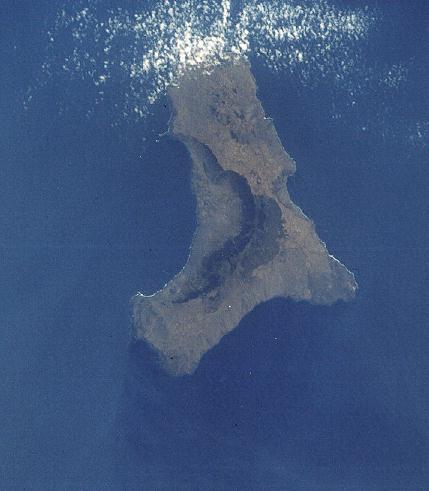 The island of Heirro in the Canary group is some 400 kilometers west of the Atlantic coast of Morocco. At one time this volcanic island was much larger. Half the old crater at left center is still seen but at some time in the distant past a massive eruption destroyed the other half of the island, crater and all. 22 July 1975. (AST-23-1939)