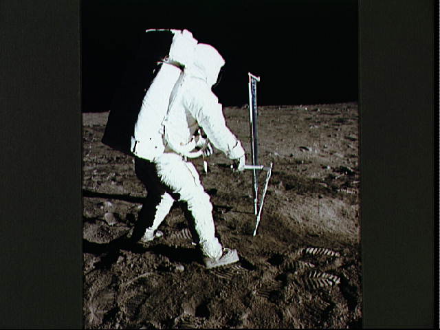 Astronaut Edwin Aldrin deploying Solar Wind Composition experiment Astronaut Edwin E. Aldrin Jr., lunar module pilot, is photographed during the Apollo 11 extravehicular activity on the Moon. Astronaut Neil A. Armstrong, commander, took this picture with a 70mm lunar surface camera. Aldrin has just deployed the Solar Wind Composition experiment, a component of the Early Apollo Scientific Experiments Package (EASEP).