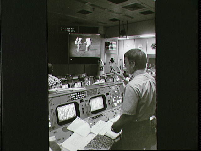 Gerald D. Griffin, foreground, stands near his console in the Mission Operations Control Room (MOCR) during Apollo 15's third extravehicular activity (EVA-3) on the lunar surface. Griffin is Gold Team (Shift 1) flight director for the Apollo 15 mission. Astronauts David R. Scott and James B. Irwin can be seen on the large screen at the front of the MOCR as they participate in sample-gathering on the lunar surface.