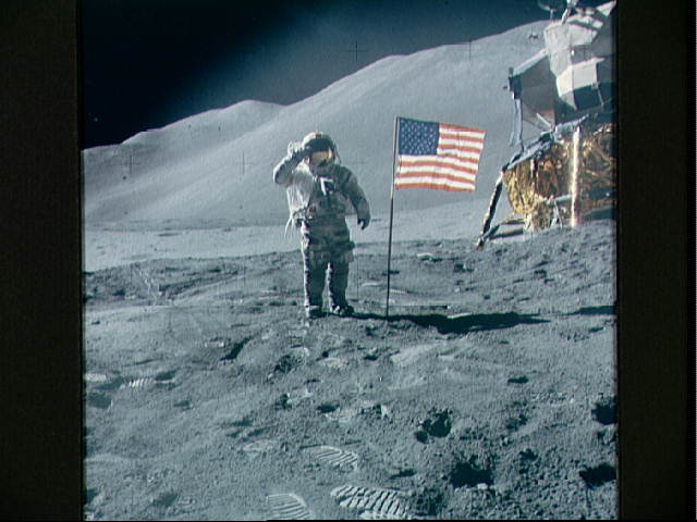 Astronaut David R. Scott, commander, gives a military salute while standing beside the deployed U.S. flag during the Apollo 15 lunar surface extravehicular activity (EVA) at the Hadley-Apennine landing site. The flag was deployed toward the end of EVA-2. The Lunar Module "Falcon" is partially visible on the right. Hadley Delta in the background rises approximately 4,000 meters (about 13,124 feet) above the plain. The base of the mountain is approximately 5 kilometers (about 3 statute miles) away. This photograph was taken by Astronaut James B. Irwin, Lunar Module pilot.