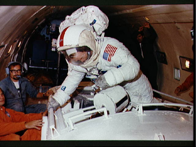Astronaut Eugene A. Cernan, commander of the Apollo 17 lunar landing mission, participates in lunar surface extravehicular activity (EVA) simulation training under one-sixth gravity conditions aboard a U.S. Air Force KC-135 aircraft. Here, Cernan simulates removing an experiment package from the aft end of a Lunar Roving Vehicle (50270); Astronaut Stuart A. Rossa, backup crew command module pilot of the Apollo 17 mission, participates in EVA simulation training aboard a U.S. Air Force KC-135 aircraft. A mock-up of the Scientific Instrument Module (SIM) bay of the Apollo 17 Service Module is used in the exercise. Here, Roosa simulates retrieving the film cassette of the Mapping Camera from the SIM bay (50271).