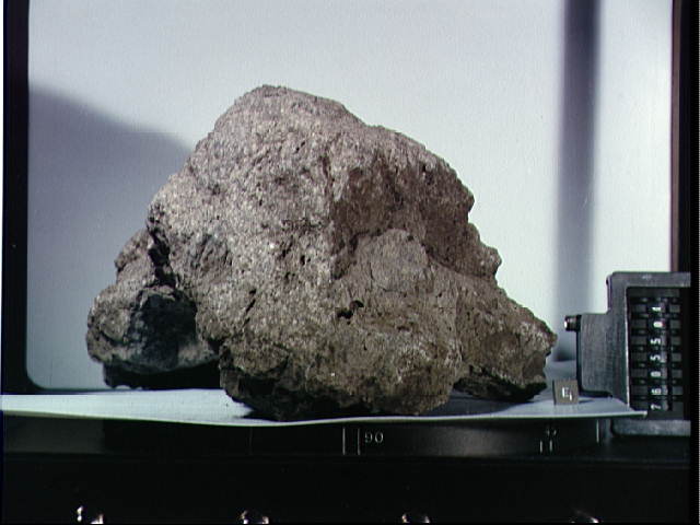 A close-up view of Apollo 17 lunar rock sample no. 76055 being studied and analyzed in the Lunar Receiving Laboratory at the Manned Spacecraft Center. This tan-gray irregular, rounded breccia was among many lunar samples brought back from the Taurus-Littrow landing site by the Apollo 17 crew. The rock measures 18x20x25 centimeters (7.09x7.87x9.84 inches) and weighs 6,389 grams (14.2554 pounds). The rock was collected from the south side of the Lunar Roving Vehicle while the Apollo 17 astronauts were at Station 6 (base of North Massif).
