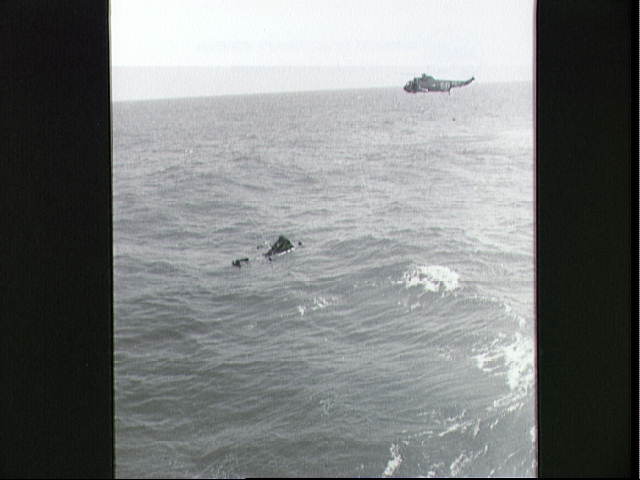 Gemini-Titan 3 water landing recovery in Atlantic Ocean Navy swimmers are shown attaching a flotation collar to the Gemini 3 spacecraft during recovery operations following the successful Gemini-Titan 3 flight. A helicopter hovers in the background. Astronauts Virgil I. Grissom and John W. Young are still in the spacecraft.