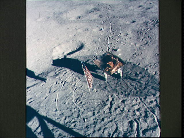 The third U.S. flag to be deployed on the lunar surface, footprints, wheel tracks and Rickshaw-type portable workbench, as seen by the Apollo 14 crewmen from inside the Lunar Module, after a busy first extravehicular activity period (EVA-1). The two-wheeled cart is the Apollo Modularized Equipment Transporter (MET), covered with a sheet of foil material to protect the cameras and rock box between EVAs.