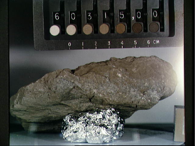 View of Apollo 16 lunar sample no. 60315 A closeup view or "mug shot" of Apollo 16 lunar sample no. 60315, one of the most dense and hardest rocks collected during Apollo 16. The sample was picked up near the end of the mission's third and final extravehicular activity (EVA-3). It has a very fine-grained grondmass in which larger, lathshaped, white feldspar crystals are embedded. Immediately after sample return, this rock was investigated for short-lived isotopes caused by solar flares.