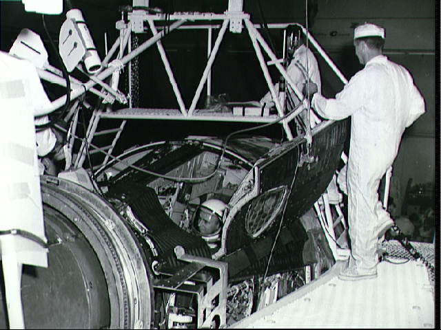 Astronauts Young and Collins prepare for Manned Altitude Test Run Astronauts John W. Young (right), command pilot, and Michael Collins, pilot, the prime crew of the Gemini 10 space flight, prepare for a Manned Altitude Test Run in the Gemini 10 spacecraft. They are in McDonnell Aircraft's 30 ft. altitude chamber.