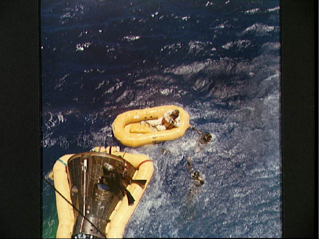 Recovery of Gemini 4 spacecraft and astronauts Recovery of Gemini 4 spacecraft and astronauts. Views include Astronaut James A. McDivitt, command pilot of the Gemini 4 space flight, sitting in life raft awaiting pickup by helicopter from the recovery ship, the aircraft carrier U.S.S. Wasp (33490); Navy frogmen stand on the flotation collar of the Gemini 4 spacecraft during recovery operations (33491).