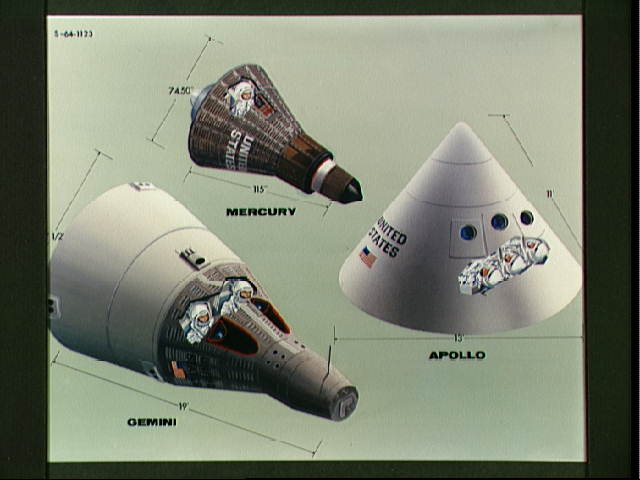 Artist concept illustrating the relative sizes of the one-man Mercury spacecraft, the two-man Gemini spacecraft, and the three-man Apollo spacecraft.